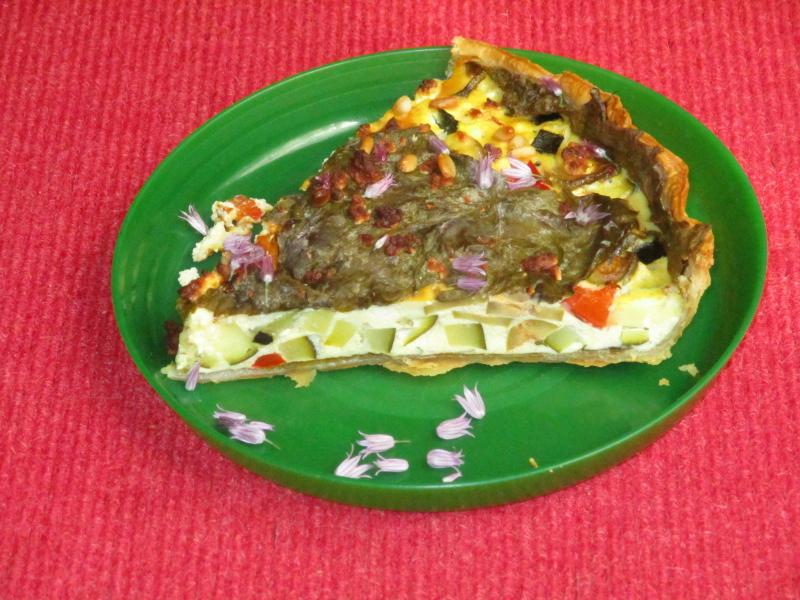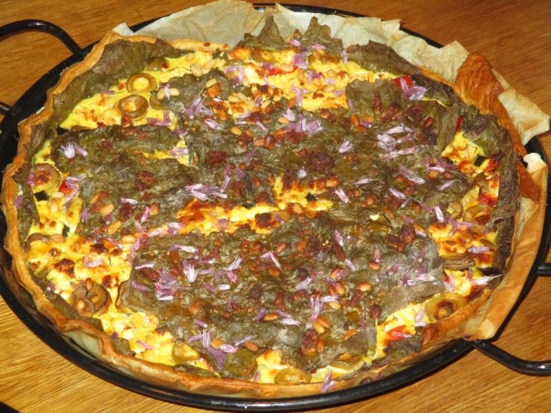 Aufbau: Blätterteig, Weinblätter, Zucchini-Paprika-Olivenringe, Eier-Quark-Feta-Mix, Weinblätter, Pinienkerne und ein paar Krümel Feta obendrauf.