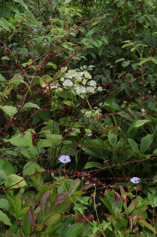 Geranium wallichianum ´Buxton´s Blue ´blüht immer erst spät, aber genau richtig zur Nachblüte von Astrantia ´Canneman´. Persicaria filiformis sät sich im Garten aus, hier darf sie bleiben.