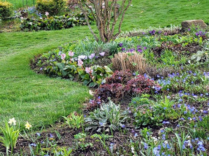 Im Hintergrund sind gerade blühende Bergenien zu sehen. Es scheint- wenn es nicht doch noch frostig wird- in diesem Jahr endlich mal wieder eine tolle Bergenienblüte zu geben. Die Blätter haben in diesem Winter zwar gelitten wie noch nie, sind zum Teil abgefallen oder ich habe einiges entfernt. Aber es sind überall schon Knospen zu sehen auch bei Sorten, die hier in Jahren noch nie geblüht haben. Ich freue mich drauf!!! :D