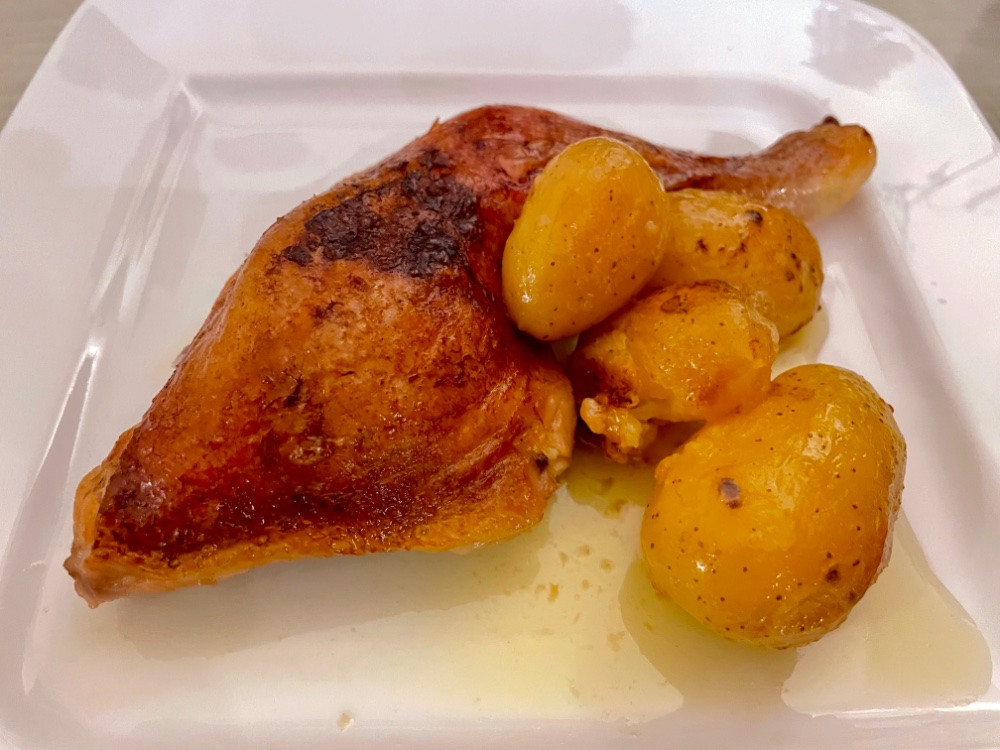 bei uns betont puristisch huhn und kartoffel