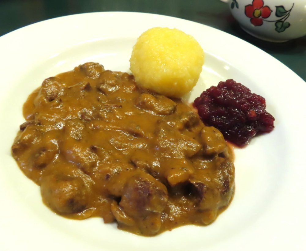 Hier gab es auch herbstliches Soulfood: Rehragout in einer Wurzelsauce mit vielen Gewürzen, dazu Waldviertler Erdäpfknödl und Preiselbeeren. Sehr sehr gut