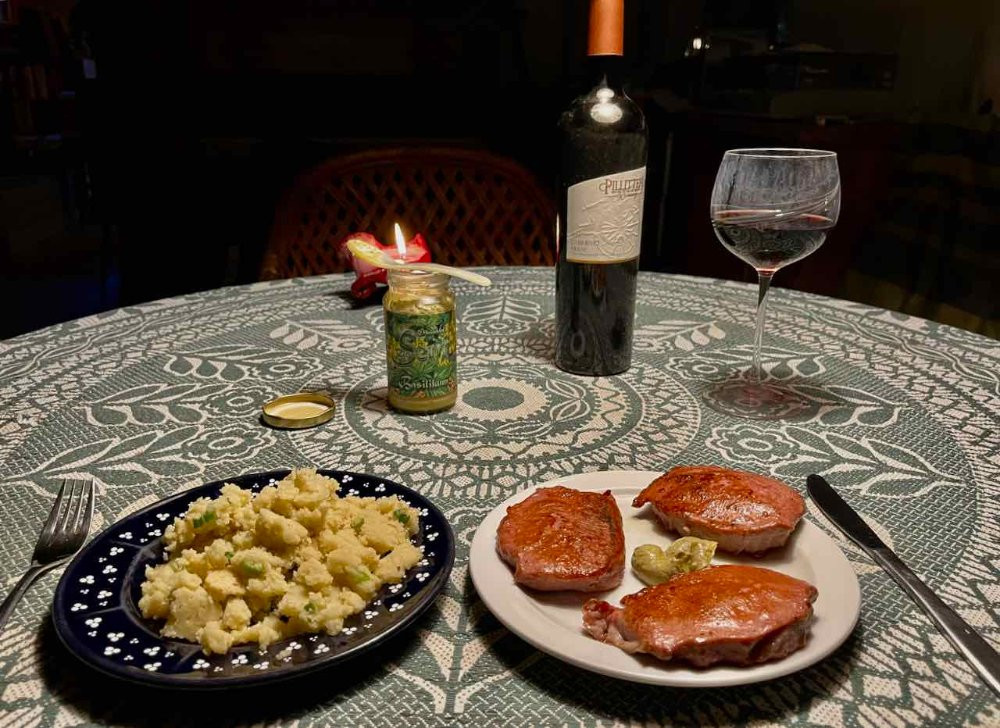 Wegen möglichem Brätverfall nochmals Leberkäs aufgebacken und abgebräunt mit Basilikumsenf und Kartoffelbrei mit Frühlingszwiebeln zum Cabernet franc 2013 aus Niagara-on-the-lake, Kanada.