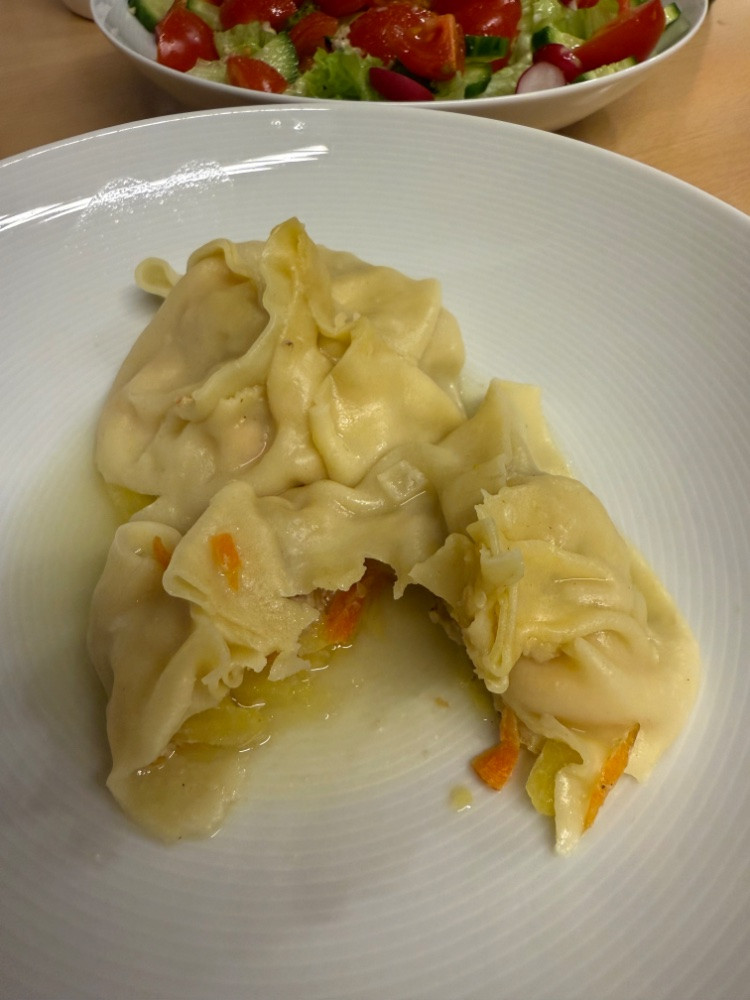 Mir ist noch Nudeltag von Maultaschen geblieben. Heute habe ich es mit gewürfelten Bauchspeck, Kartoffeln, Karotten und Zwiebel gefüllt. Salat dazu