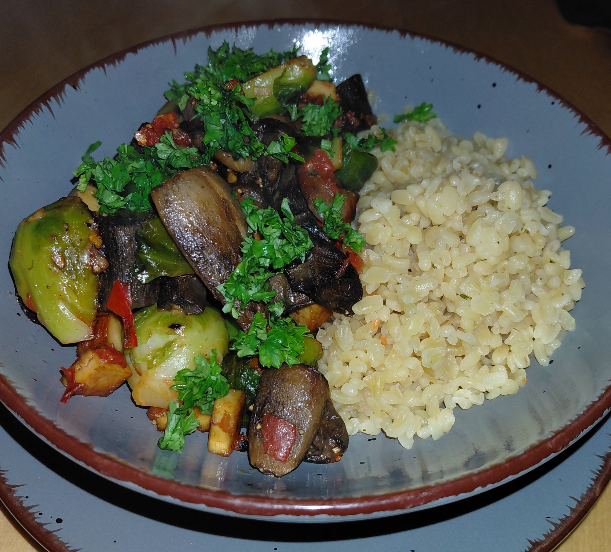 Rosenkohlpfanne mit Rotkappen und Räuchertofu