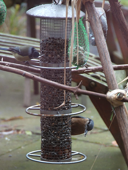 ), dafür haben wir große Invasionen: Grünfinken, Kohl- und Blaumeisen, Feldsperlinge, Zeisige, mehrere Kernbeißer, ein Buntspecht, Kleiber, Amseln, Rotkehlen, Zaunkönig, auch ein paar Ringeltauben. Wintergoldhähnchen kommen zwar jeden Tag, aber sie putzen die Kiefern. Ich habe übrigens festgestellt, dass eine Futterstelle im Garten den ganzen restlichen Garten (ziemlich unaufgeräumt dieses Jahr