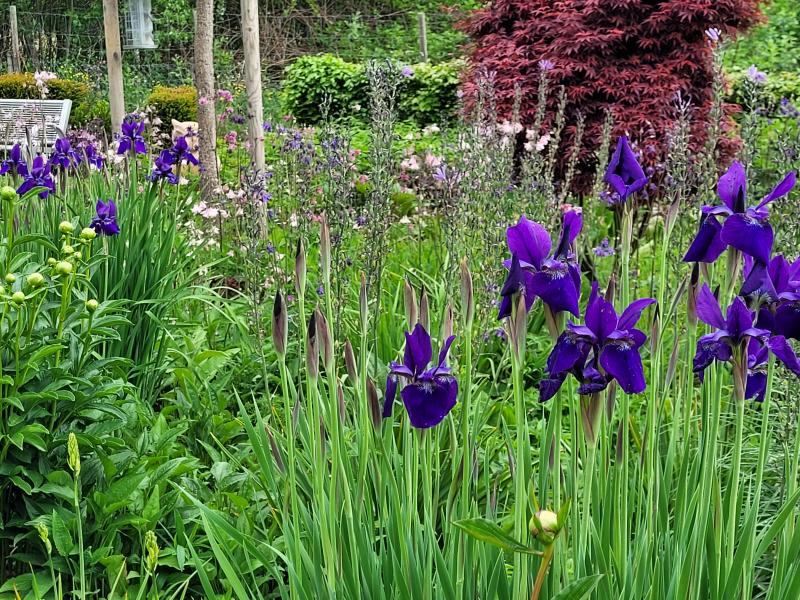 Iris sibirica caesar's brother öffnet ihre erste Blüte... zahlreiche Knospen sind noch geschlossen.