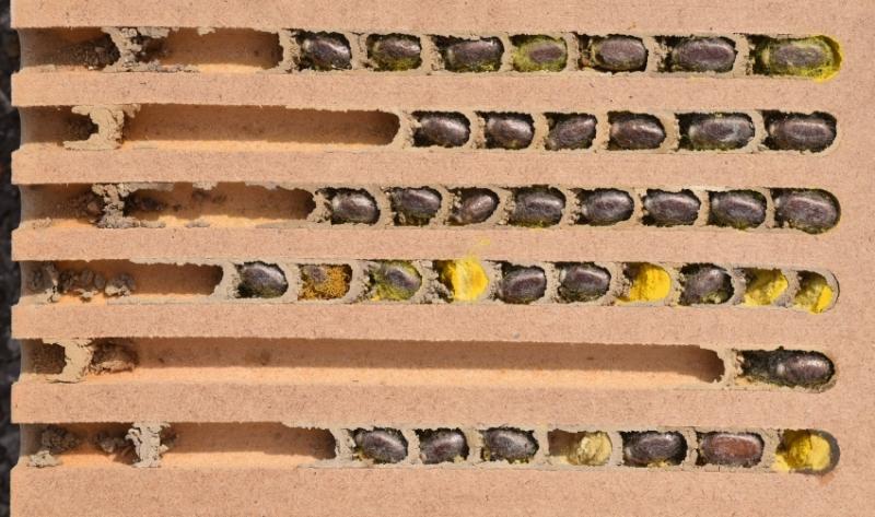 Hier die Einsicht in eine meiner Nisthilfen, wo vorne die Verdeckelungen weggeregnet waren (man sieht noch die Reste bzw. Abdrücke). Ein möglichst trockener Standort sollte natürlich trotzdem angestrebt werden, aber man muss jetzt nicht panisch vor Schlagregen oder Gewittern sein.