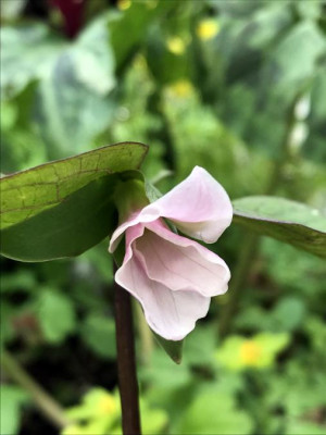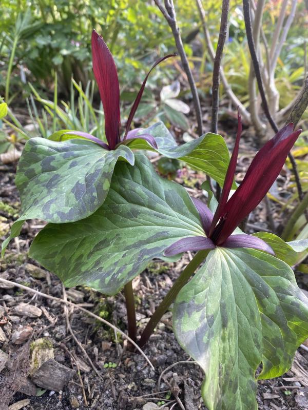 Ein Tausch einer lieben Gartenfreundin , noch im Topf. Trillium grandi. Roseum