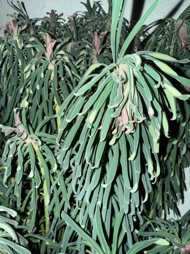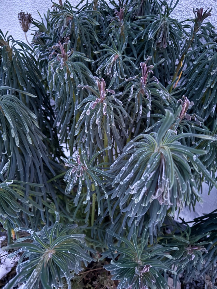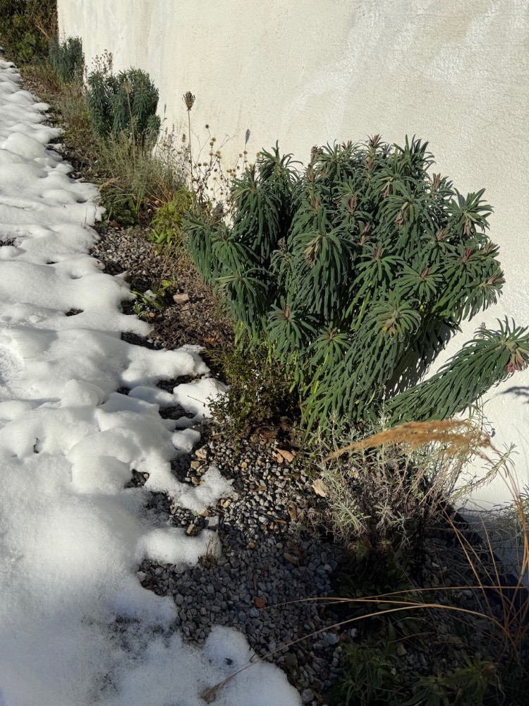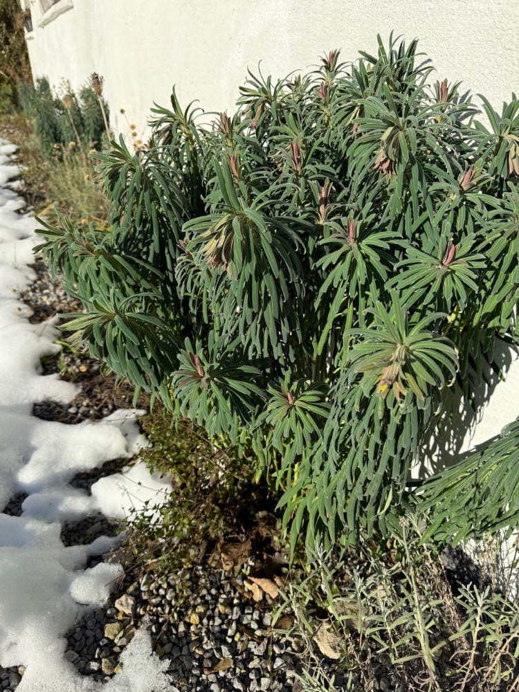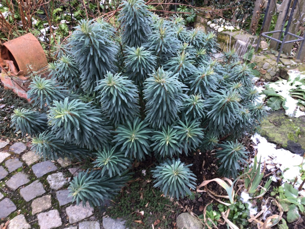 In diesem Winter mussten meine E. characias erst -4 Grad aushalten, im letzten Winter aber klaglos -13 Grad ausgehalten. Es ist die Sorte Black Pearl. Eine panaschierte Sorte hatte sich schon bei Temperaturen nahe -10 Grad vollständig verabschiedet.