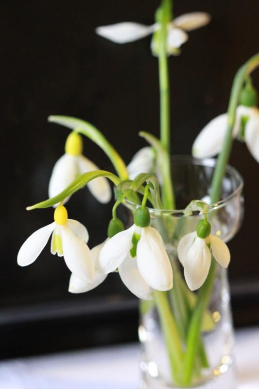 Eigentlich sehe ich meine Schneeglöcken lieber im Garten blühen, aber heute habe ich doch mal einige völlig erstarrte Blüten ins Haus geholt und in ein Glas gestellt. Sie haben sich innerhalb einer knappen Stunde geöffnet.