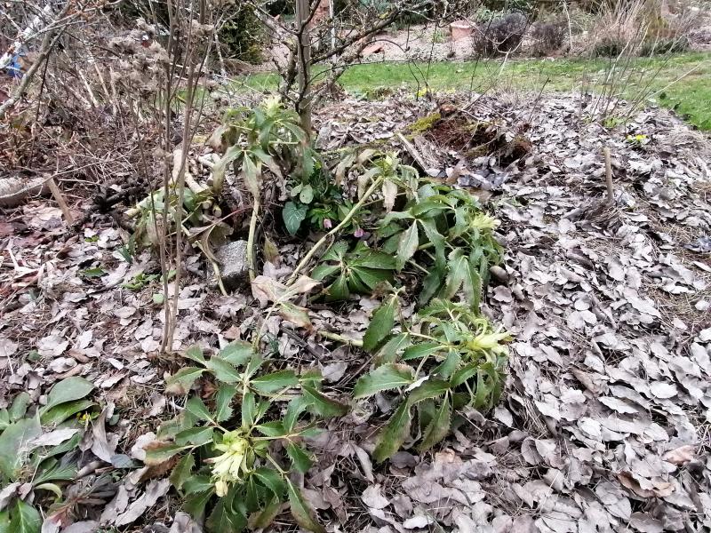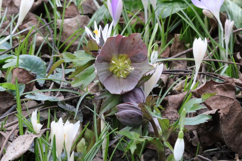 Helleborus purpurascens, sehr klein, sehr früh. Das alte Laub ist völlig in die Streu versenkt.