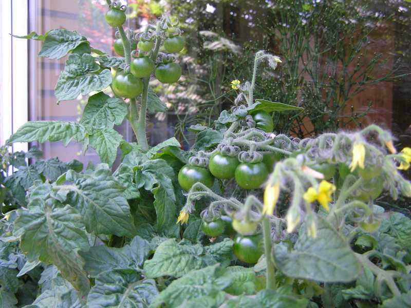ich bin positiv von der topftomate minibel überrascht. steht wirklich in kleinen töpfen außen auf der fensterbank und ist etwa 20-30 cm hoch, hat aber einen super fruchtansatz! hoffentlich schmecken die auch gut