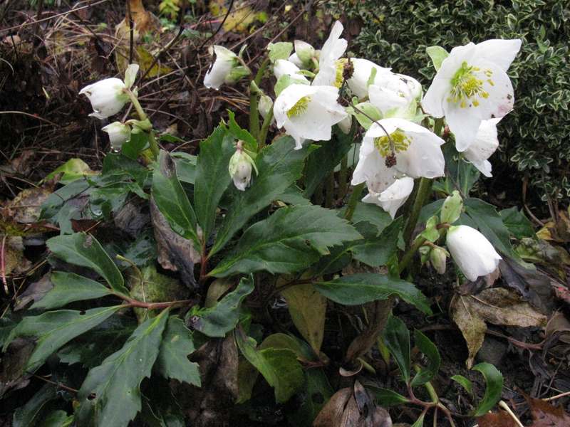 Vielleicht sollte ich wirklich einmal gezielt kalken? Hier das Bild meiner eigentlich zuverlässig zu Weihnachten blühenden Christrose. Nur so richtig makellos ist sie leider noch nie gewesen.Bei mir blüht H. niger heuer üppigst. Und das in relativ saurem sandigen Boden. Vielleicht liegt es am Betonpflaster, das Kalk abgibt?Leider mit vielen braunen stellen im Laub! Ein Pilz? Aber das hat sie eigentlich jedes Jahr.(Foto folgt..)