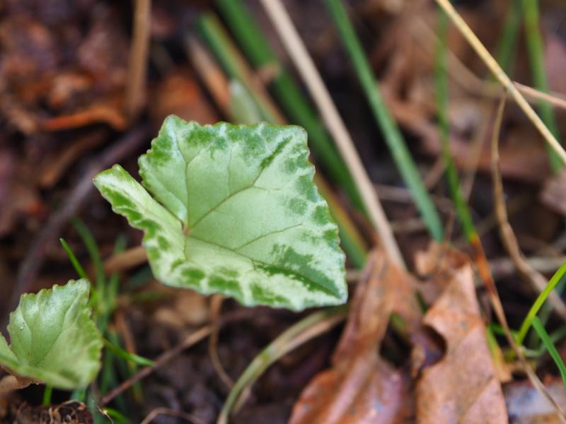 und schon sind die Cyclamen integriert und entfalten sich. Zwischen Carex 'Everillo' und Helleborus foetidus Golden Bullion. Eins mit dunkler Blüte.