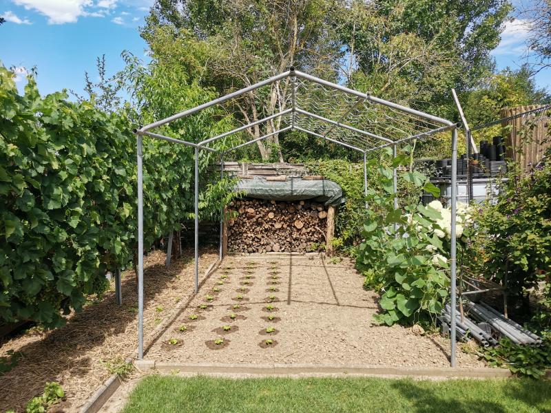 Zucca di pergola (rechts im Bild) hat jetzt Wuchs aufgenommen und wird aufs Dach geleitet, damit die Früchte frei hängen können.