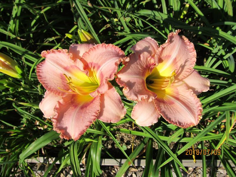 Im Sämlingsgarten werden hier zwei rosa Typen gerade immer schöner (blühen seit ca. einer Woche) - möglicherweise gibt es so etwas ja mit Blütezeit midseason, bei den späten kenne ich nichts Vergleichbares. Der erste hat kleinere Blüten - ca. 10-12 cm auf 80 cm hohen Stängeln mit schöner Verzweigung und noch vielen Knospen. Die Blütenblätter sind rund und am Rand leicht gerüscht, die Farbe ist klares Rosa, aber der schlund ist Mango-Orange. Leider zeigt die Kamera den wunderbaren Effekt im Sonnenlicht nicht wirklich: