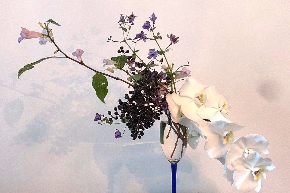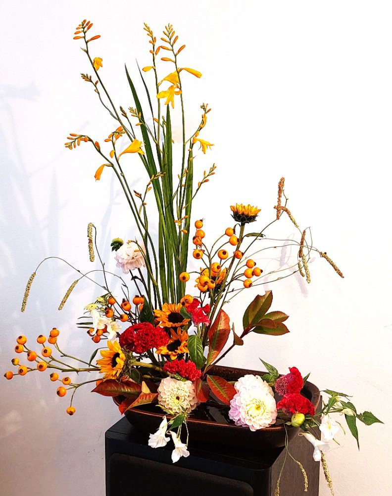 Mit etwas Ligusterbeeren, Impatiens und Clerodendrum ug. (vom Einräum-Kübelpflanzenrückschnitt) noch für einige Zeit ansehnlich...