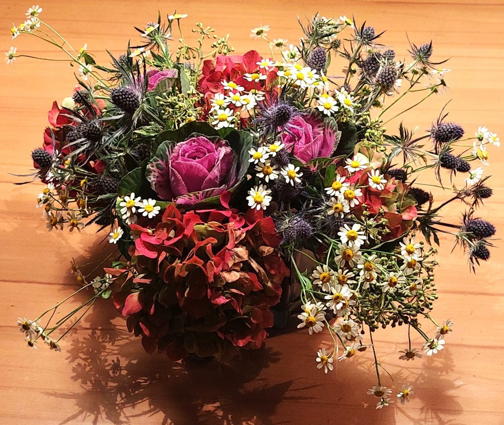 Auch sonst ist im Garten Vieles nicht mehr ansehnlich. Die vertrockneten Hortensien sind in diesem Jahr aber so rot gefärbt wie selten und geben dem Strauß Volumen, zusammen mit dem Zierkohl.
