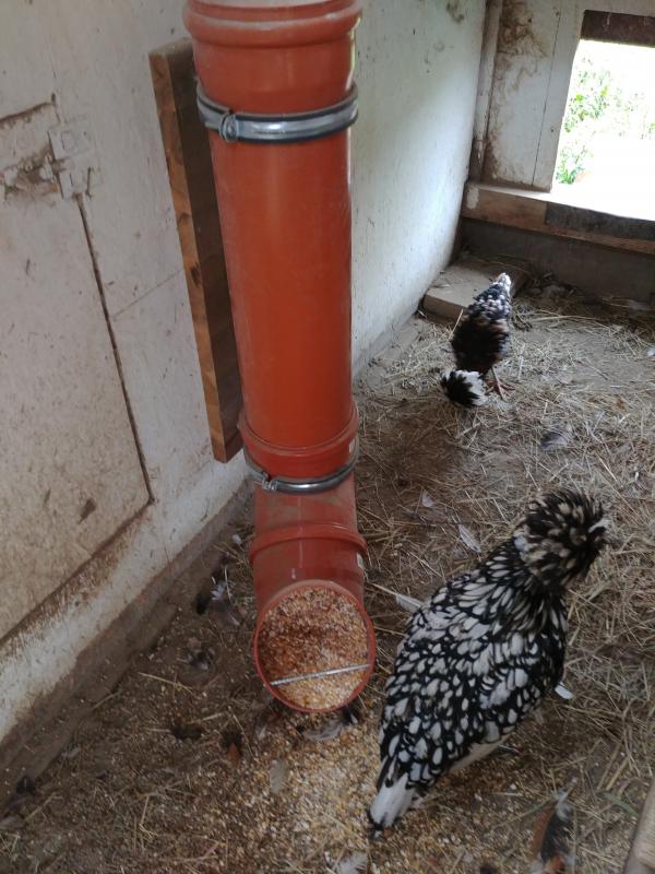 da kann man einen halben Sack Futter reintun und es rutscht stets unten ins Knie nach wenn die Hühner unten wegfuttern .. ich hab noch unten eine SChraube eingezogen, damit die das Futter nicht rausscharren können ....
