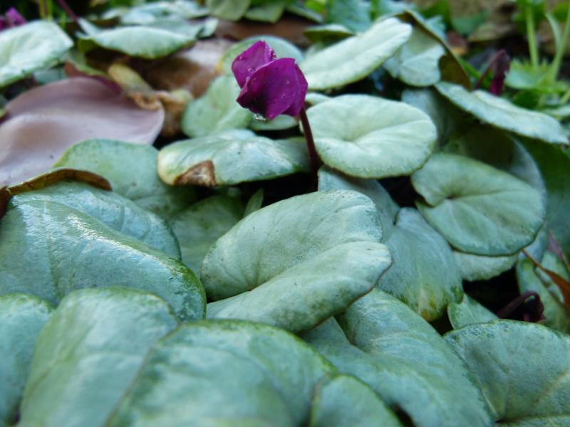 Dieses C. coum finde ich eher schrill als schön: weißes Laub (das ist sowieso nicht mein Fall) und die Blüten dagegen in einem recht dunklen Violett. Aus einer Aussaat, erstmalig in Blüte.