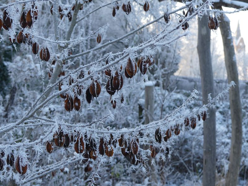 Mein Malus 'Evereste' hing auch sehr voll, aber die Amseln sind eifrig am plündern. Wenn der Winter richtig beginnt, werden wahrscheinlich keine Äpfelchen mehr da sein.