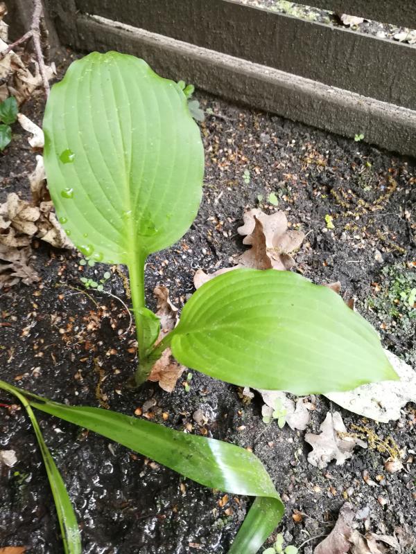 Und das hier wächst unter dem Kirschlorbeer. Für mein noch unerfahrenes Auge sieht es nach Hosta aus, ich habe da aber keine gepflanzt. Flora Incognita fällt nichts dazu ein, PlantNet sagt Hosta plantaginea oder Curcuma. ;D