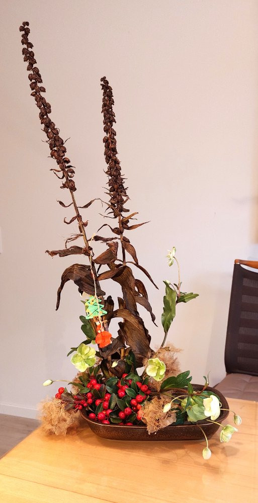 Die 2 ausgeschüttelten (ich will noch mehr im Garten!) abgestorbenen Epipactistriebe. die filigranen Hortensienwuschel (2 Jahre alt), die ersten Lenzrosensämlingsblüten von der geschützten Hauskante und die Gaultherien lassen zum Jahreswechsel über Vergänglichkeit nachdenken.