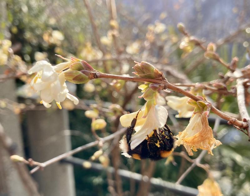 Niedriger Frost scheint der Lonicera nichts auszumachen und sogar eine noch sehr träge Hummel findet Futter!