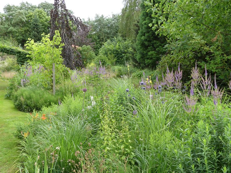 Im großen Beet dominieren gerade Echinops ritro und Veronicastrum 'Fasciation'.