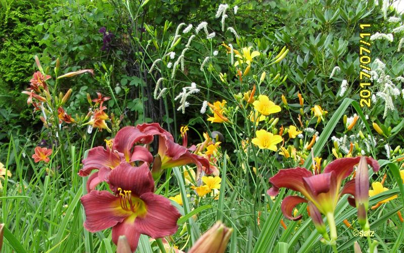 ein anderer unbenannter sämling, sehr reichblütig, goldstaubeffekt(das ist nicht nur vom sprühregen), das gelb leuchtet durch den garten