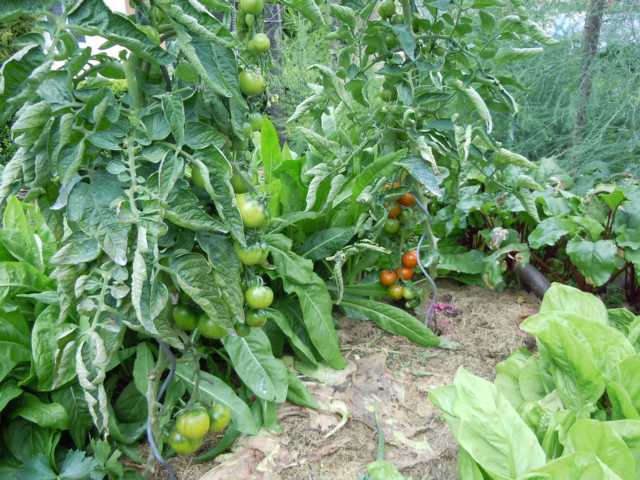 Die Buchshecke sieht in der Tat (noch) gut aus. Die ist aus Stecklingen gesteckt, als ich mich noch nicht mit der Thematik Buchs und Buchssterben befasst hab. Heute würd ich keine Buchshecke mehr anlegen.Hier ist es auch nass. Hab vorhin die Freilandtomaten etwas geschüttelt, damit das Wasser abtropft. Gleich drauf hats wieder kurz geduscht.
