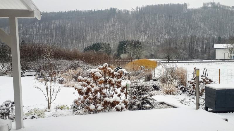 Diese Nacht hat es sogar bei uns geschneit, was ja wirklich selten vorkommt. So habe ich mich heute morgen sehr gefreut, dies beim Blick aus dem Schlafzimmer zu sehen: