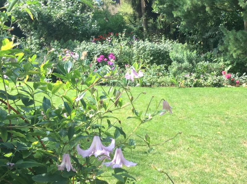 Der Phlox ist dieses Jahr sehr niedrig, rechts neben dem kräftig pinkfarbenen steht noch ein etwa kniehoher Blue Paradise :-X. Wenigstens brauche ich sie dieses Jahr nicht zu stützen. Dahinter sollte Rose Plaisanterie üppig blühen, weiter rechts noch Blush Noisette. Ist ihnen wohl allen zu trocken, aber wenigstens leben sich noch.