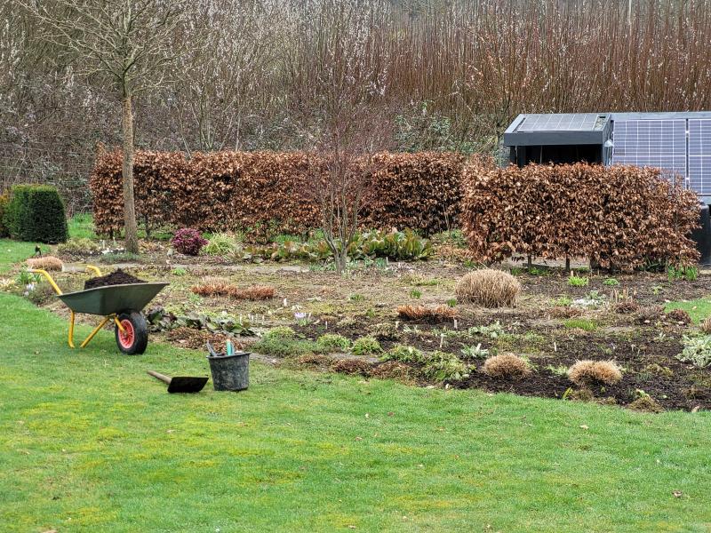Allerdings schreitet das Frühjahr bei extrem mildem Klima schnell voran, sodaß ich mit dem Rückschnitt von Stauden, Gehölzen und Gräsern relativ früh begonnen hatte. Heute bin ich soweit durch, wobei ich mit dem Rückschnitt von Rosen, Buddleja oder Perovskia wie immer noch ein wenig warte. ;)