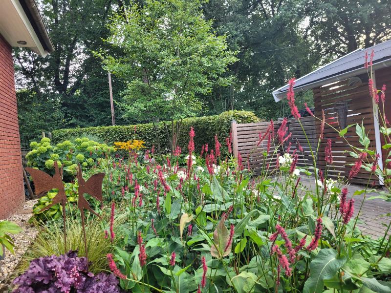 Erstaunlich gut macht sich Hydrangea paniculata 'Limelight' hoch auf dem Terrassenbeet zusammen mit den beiden alten Azaleen, denen ebenfalls wenig Stress anzumerken ist. Das trifft auch auf Hakonechloa 'Aureola' zu. Auch das frisch umgestaltete Terrassenbeet davor hält sich recht gut. :)