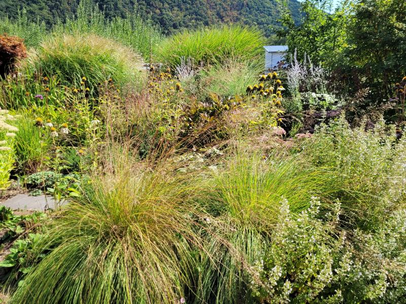 Für zweiwöchige Abwesenheit sieht der Garten grün, üppig und farbenprächtig aus. Das Steppenbeet gefällt mir besonders.