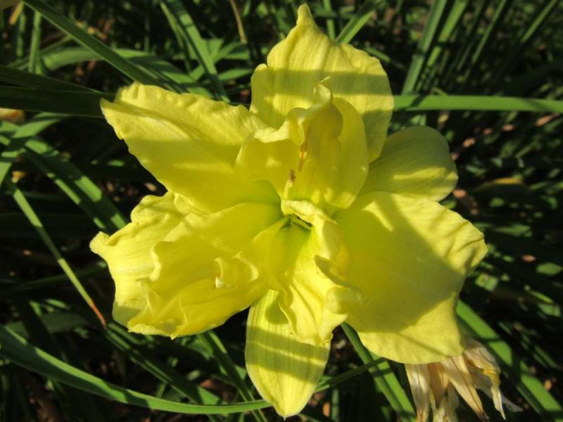 Eine hellgelb gefüllte, ich nehme einen leichten grünen Unterton wahr, es befinden sich recht wenige Blüten am Stiel, soviel ich weiß ist dies bei älteren gefüllten Sorten normal? 9cm Durchmesser, 80cm hoch.