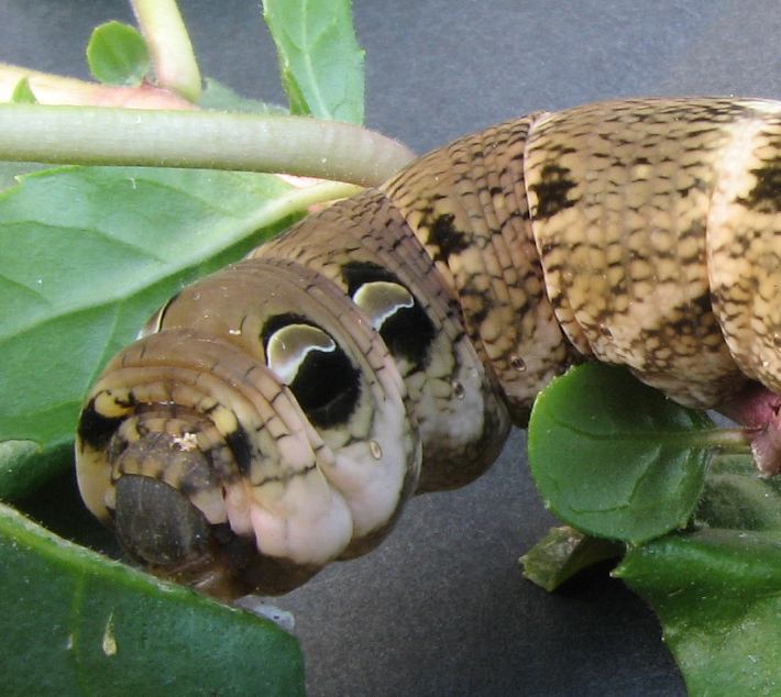 Mittlerer Weinschwärmer Raupe Deilephila elpenorIch musste soeben feststellen, daß dieser dicke Elefant (er hatte sage und schreibe ein Längenmaß von 9 cm) einen Teil meiner größten Fuchsie skelettiert hat. Ich habe ihn nach dem Fotografieren an einem Drüsigen Springkraut an schattiger Stelle am Bach abgesetzt.