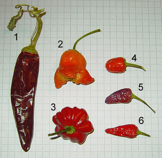 Hallo Chillifreunde, ich habe vor zwei Wochen einige Früchte zur Samengewinnung geschenkt bekommen, leider konnte der edle Spender mir die Namen nicht sagen. Vielleicht könnt Ihr mir ja helfen? Ein paar Namen habe ich herausbekommen, bei der auffälligen Form keine Kunst: 1 mild und fruchtig2 Peri Peri, Glockenpaprika, Bischofsmütze3 Starfish, Seesternpaprika4 könnte von der Größe her Pis bas harari sein, ich weiß aber nicht, ob die Beeren mit der Spitze nach oben wuchsen. Wenig scharf, wenig aromatisch, noch nicht reif? 56 etwas schärferDie anderen probiere ich lieber (noch) nicht, wer weiß ...