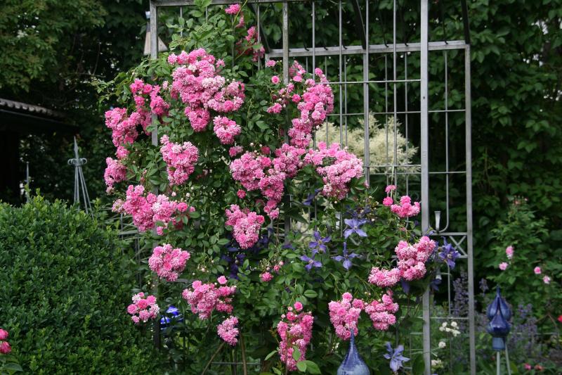 Die anderen Viticellas toben sich in Bäumen oder an Rankgerüsten aus. Die Rosen stehen mit Abstand dabei.