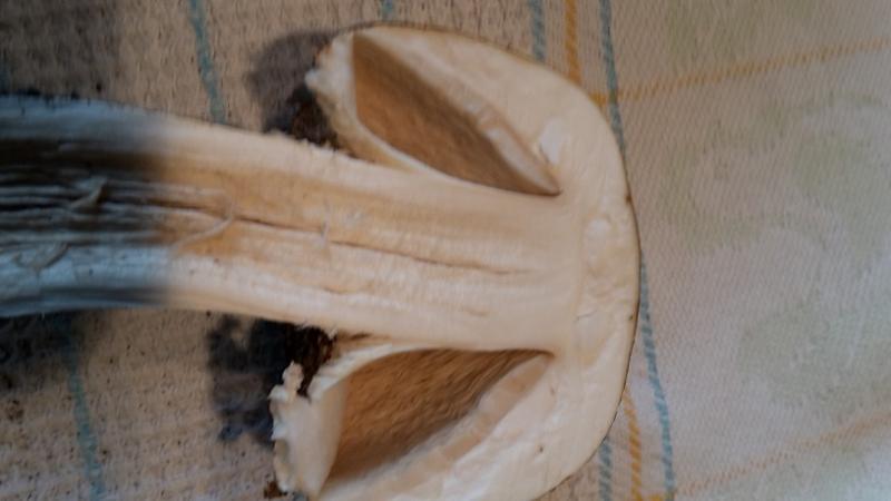Zuerst dachte ich an junge Parasole, aber dafür war der Stiel nicht lang genug. Daneben stand noch ein älteres Exemplar, nicht höher als 20 cm, der Hut war bei diesem nach oben aufgewölbt.