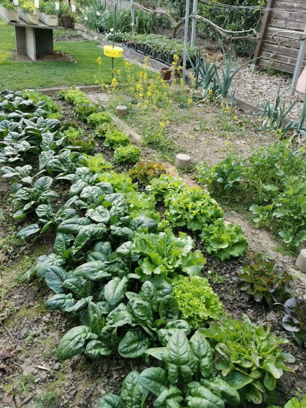 Die Pflänzchen ließen sich dann später noch relativ klein direkt ins Beet verpflanzen, der Rest blieb in der Wanne und wurde nach und nach als Pflücksalat ausgedünnt.