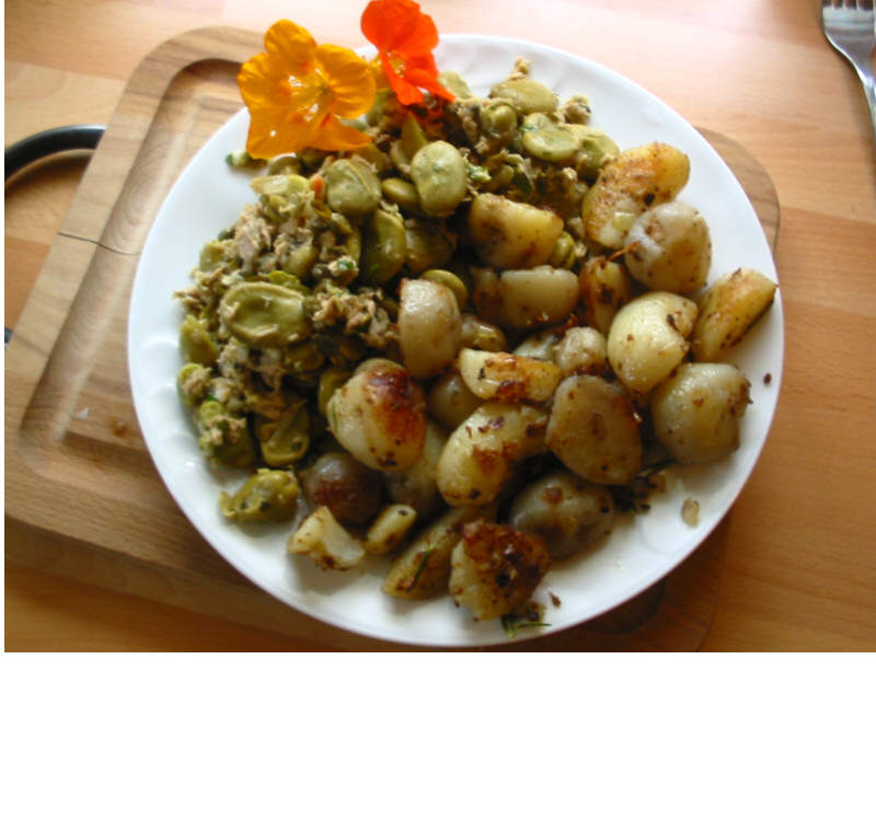 !Der Besuch ist weg, jetzt darf ich wieder Fotos einstellen:Donnerstag gab´s einen Salat aus Dicken Bohnen mit Thunfisch und Kapern, dazu die ersten Bratkartoffeln (aus gekochten) aus den ersten eigenen Kartoffeln: