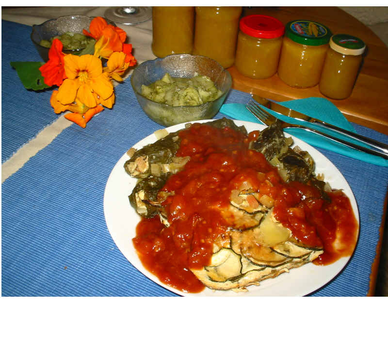 !Zum Kartoffel-Zucchini-Auflauf gab es (gestern natürlich) mit Frischkäse, Parmesan, Semmelbrösel, Mangoldstielen und Knofi gefüllte Mangoldröllchen.Dazu eine Chili-Tomatensauce, Gurkensalat und als Nachtisch Taras schnelle Mousse au Chocolat.Im Hintergrund noch die ebenfalls gestern gekochte Zucchini-Apfel-Marmelade nach GF´s Rezept.