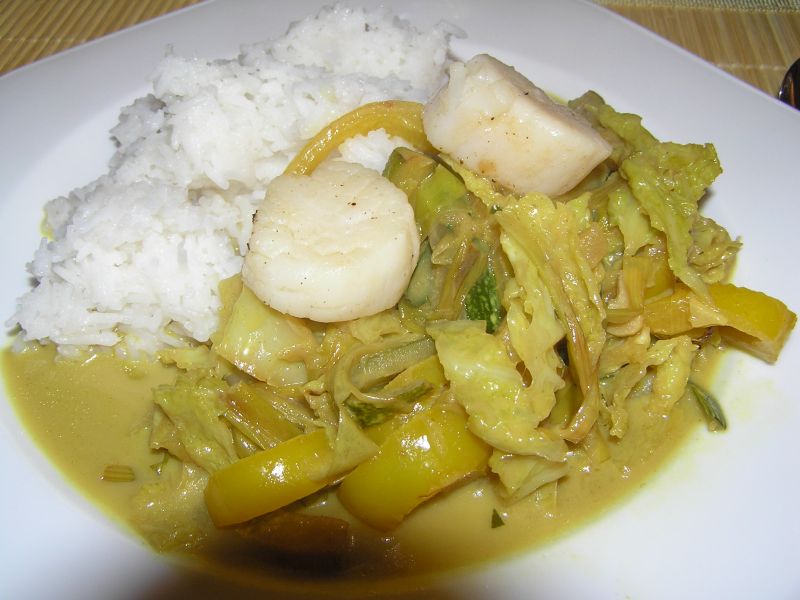thailändisch.allerlei gemüse in kokosmilch..scharf.dazu basmatireis und für jeden zwei jakobsmuscheln, die noch im tiefkühler rumlungerten.