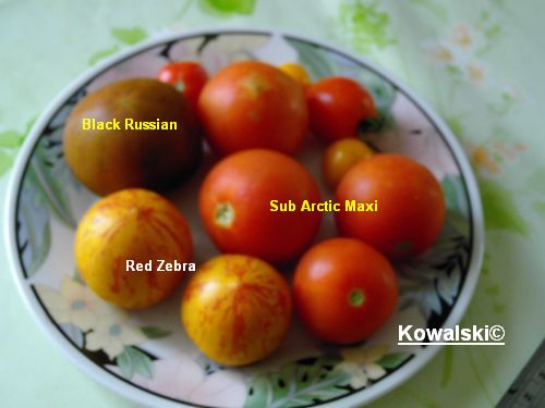 Hallo!Endlich ist meine neue Kamera eingetroffen und ich kann die Ernte der letzten vier Tage ablichten und präsentieren... ::)Besonders die eigenwillige Färbung meiner Red Zebras hat es mir angetan. - Auf Bildern sieht die Sorte anders aus, deshalb nehme ich eine Verkreuzung beim Vorbesitzer an. Aber wenn das Ergebnis so spektakulär daher kommt, will ich mal nicht schimpfen. Und zudem scheinen die anderen am Strauch, schon eher dem zu entsprechen, was man auf den diversen Bildern Red Zebra nennt... ;)Meine Black Russian scheint noch nicht die letzte Farbe zu haben, aber beim Befühlen wirkte sie schon recht weich. Beim heutigen Verschmausen, wird sich ja heraustellen, ob ich zu früh gepflückt habe... :DLGSonja