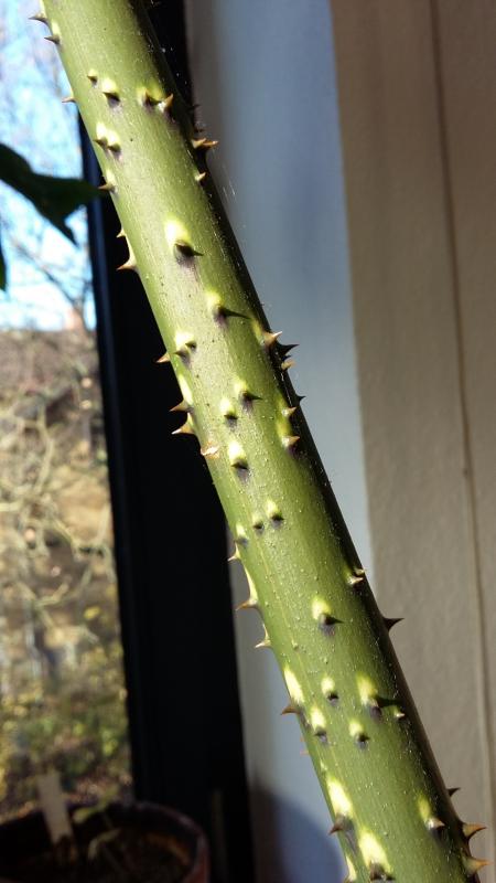 Hier zeige ich ein Foto vom Blattstiel von Anchomanes giganteus. Ok, kein Amorphophallus, aber recht ähnlich. Die Araceen verblüffen ja immer wieder mit den tollen Mustern am Blattstiel. Dieser Anchomanes hier hat mich durch diesen kleinen dunklen Fleck unter den Stacheln so fasziniert: ein künstlicher Schatten, der die Stacheln plastisch hervorhebt. Und oben drauf eine helle Verlängerung, die ebnefalls den Stachel optisch vergrößert. Was ist die Evolution ideenreich!!! Dieses Wundern war damals Grund genug, die Pflanze auszusäen. Blüht sogar gelegentlich ohne zu stinken!!! Wächst unkompliziert im Zimmer (von der unpraktischen Größe mal abgesehen).