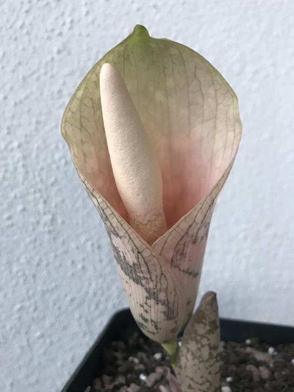 Mit Geruchsnoten von tagelang getragenem Turnschuh und Hundehaufen hat Amorphophallus bulbifer einen Blütenstand geöffnet. Nur etwa 15 cm hoch, aber es hat gereicht um den Topf morgens sofort auf den Balkon zu verbannen. ;D
