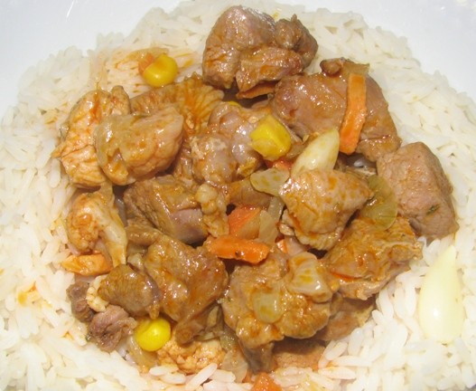 heute gab es grade eben putengeschnetzeltes (pute, moehrchen, etwas mais, blumenkohl-reste, zwiebeln und knobi) auf einem reisbett.