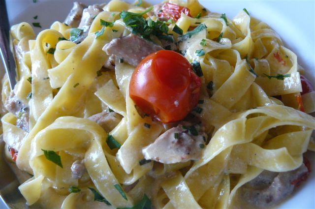 .. es gab:bunter Blattsalat aus dem Gartenselbstgemachte Nudeln mit Kalbfleisch an einer WeissweinsauceHagenbutten-Sorbet mit Apfel-Schaumwein